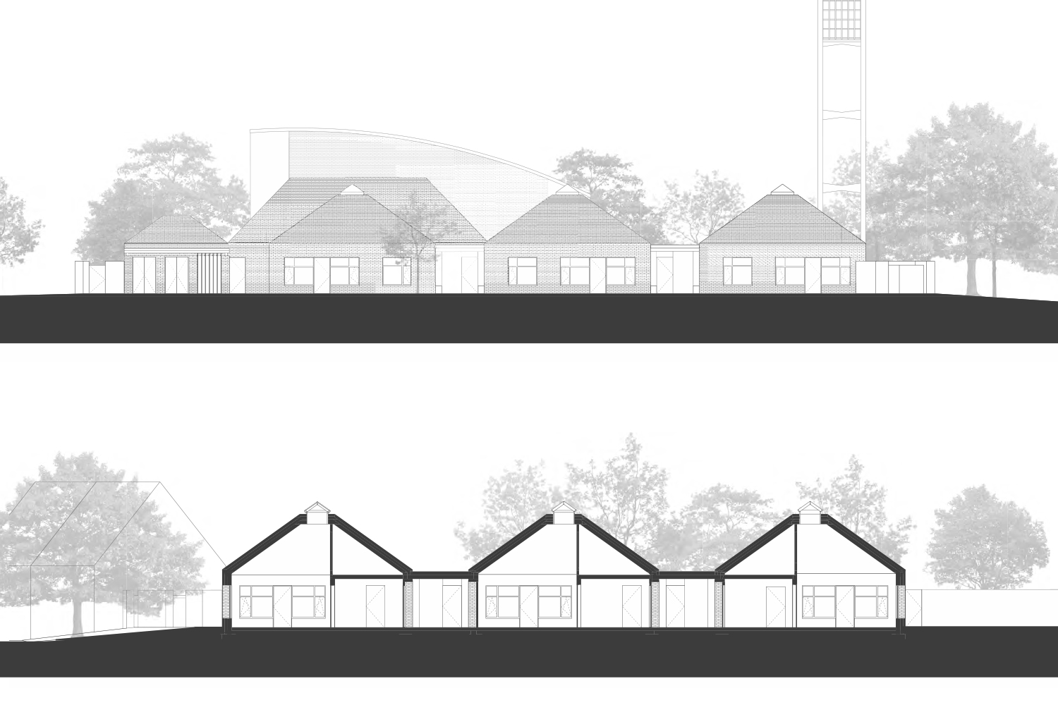 Das Gemeindezentrum St. Konrad in Neuss ist ein eigenständiger „Ortskern“ im Ort. Die markante Kirche und das Ensemble einzelner Baukörper, bilden gemeinsam den Kirchplatz. Durch den Kirchturm, die Bestandskirche und den neuen Baukörper bestehend aus Pfarrsaal und Kindergarten wird ein Platzraum definiert, der Offenheit signalisiert, einladend wirkt und Geborgenheit bietet. Die Taufkapelle wird in diesem Platzgefüge freigestellt und erhält so eine besondere Bedeutung. Durch diese Untergliederung und durch die gewählte Dachform wahrt der Komplex die städtebauliche Körnung des Ortes und trägt sie weiter.