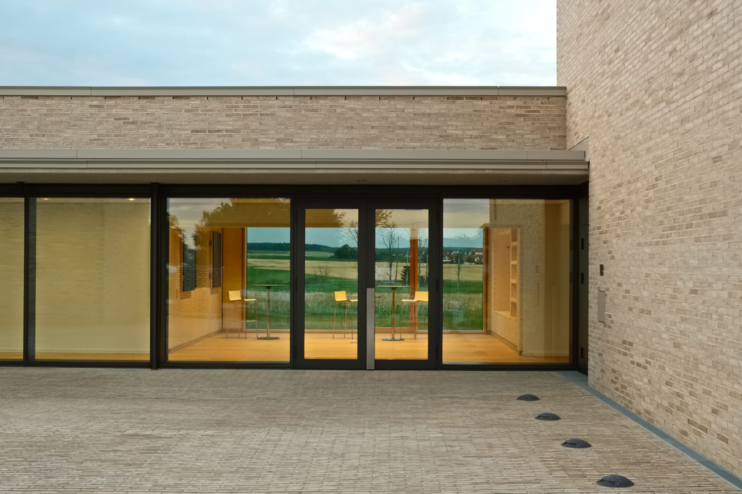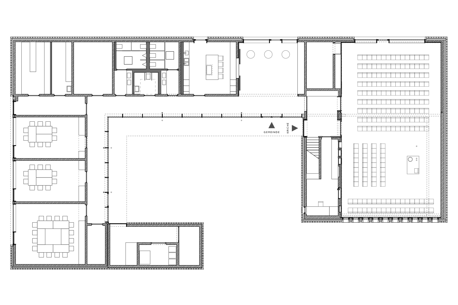 Das Dietrich-Bonhoeffer-Gemeindezentrum definiert mit kompakter, plastisch ausgebildeter Hoftypologie einen neuen signifikanten Ort auf einer kleinen Anhöhe am nordwestlichen Ortsrand von Kösching. Kirche, Gemeindezentrum und Glockenturm gruppieren sich um einen zentralen Innenhof der sich nach Süden öffnet.