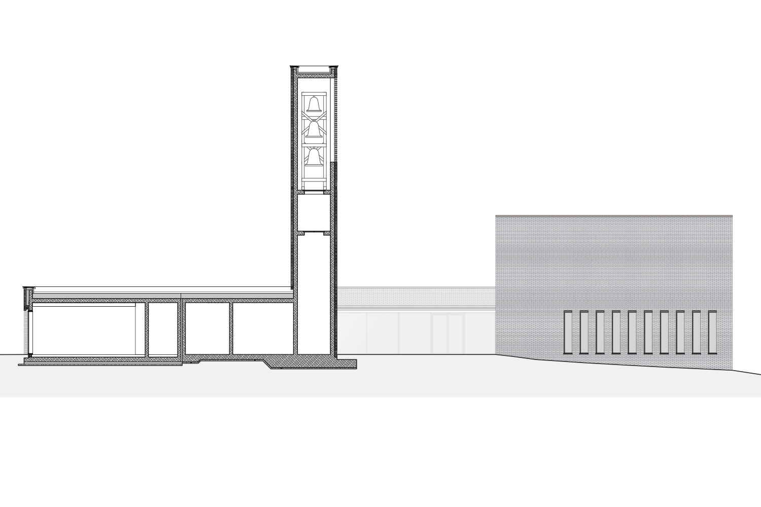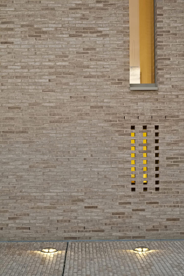 Die differenzierte Höhenstaffelung des Gebäudes gliedert den Gebäudekubus und lässt seine Inhalte ablesen. Der Baukörper bildet aus Kirchenraum und Gemeindehaus und dem weithin sichtbaren Glockenturm eine kompositorische Einheit. Der Zugang zur Anlage wird von Kirche und Glockenturm flankiert und steht mit einer deutlich sichtbaren Öffnung im Dialog mit dem öffentlichen Raum. Der Neubau wird von einer einheitlichen Materialität aus Ziegelsichtmauerwerk geprägt.