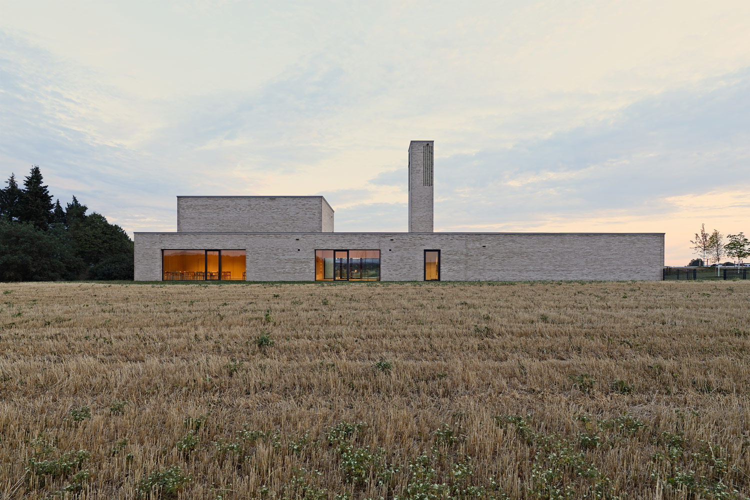 Es wurde ein unregelmäßiger Wasserstrich-Klinker ausgewählt, der in seiner fein differenzierten Farbgebung harmonisch die erdigen Farbtöne der umliegenden Äcker aufnimmt. Als sichtbares christliches Zeichen wurde im Glockenturm ein Relief aus Backstein in Form eines Kreuzes eingearbeitet. Die Fassaden des Innenhofes sind auf zwei Seiten geschosshoch verglast und erweitern den Innenhof optisch bis tief ins Innere des Gebäudes. Das geistliche Zentrum bildet der zweigeschossige Kirchenraum, der im Westen durch eine Empore ergänzt und im Osten von einer natürlich beleuchteten Lichtwand begrenzt wird. Die nur durch ein Oberlichtband beleuchtete Altarrückwand erzeugt eine stimmungsvolle, kontemplative, Raumstimmung. Zusätzliches diffuses Licht erhält der Kirchenraum aus seitlichen Fenstern hinter einem Lamellenvorhang aus Holzprofilen. Eine vollständig öffenbare Schiebewand ermöglicht den Zusammenschluss des Gemeindesaals mit dem Kirchenraum. Die Prinizipalien sind im Altarblock vereint und symbolisieren die Sakramente. Für den Kirchenraum wurde von Olafur Eliasson das Kunstwerk „Der Lauf der Sonne“ mit insgesamt zwölf Ellipsen aus „schwebenden“ Messingprofilen geschaffen.