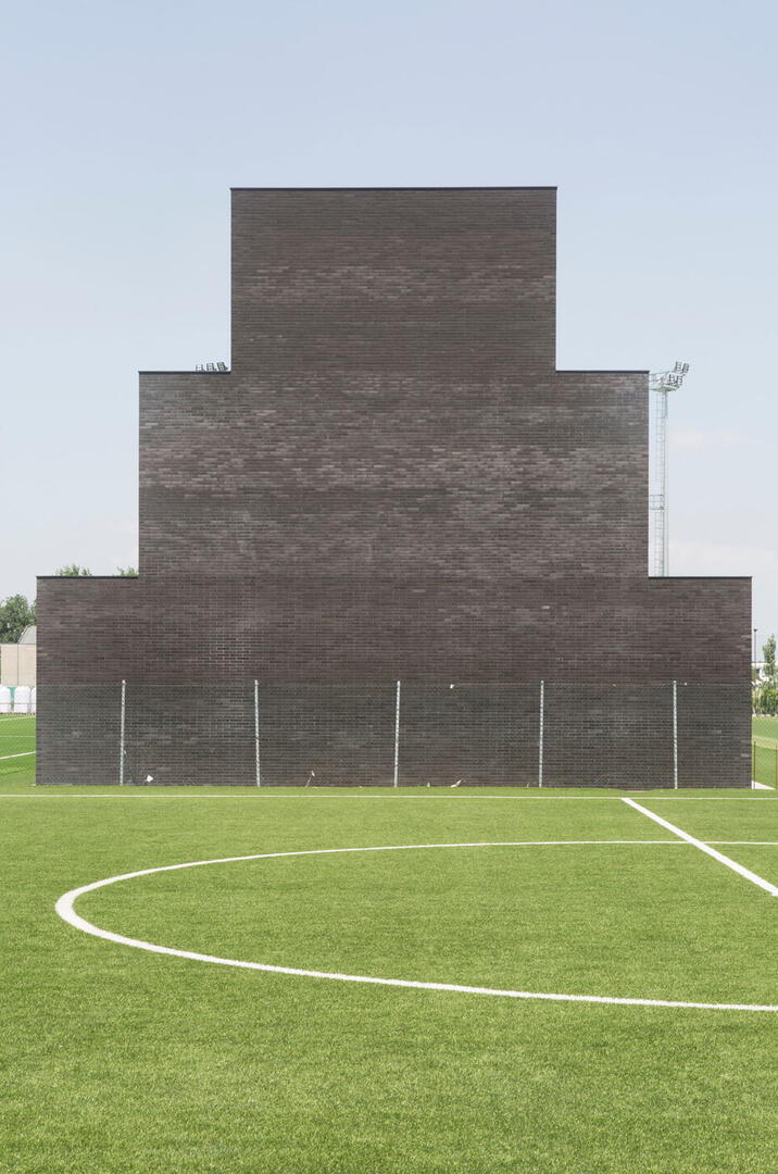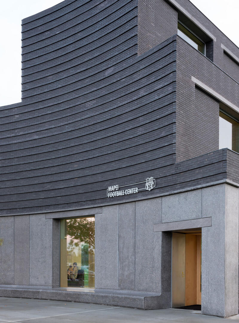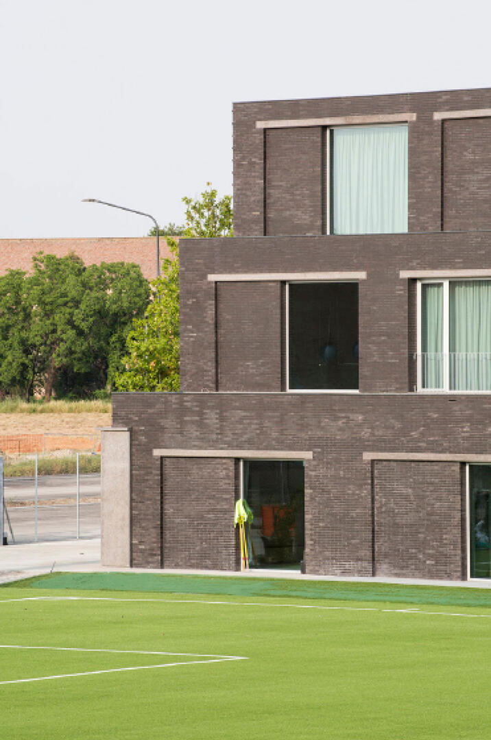 Das Mapei Football Centre besteht aus sechs Fußballfeldern, einer überdachten Tribüne sowie einem Hauptgebäude. Das Projekt beschäftigt sich mit der Form, erfüllt jedoch zugleich ein funktionales Programm, das vertikal geschichtet ist. Der traditionelle Ursprung dieses Volumens, seine erdige Materialität aus Ziegeln und die konkaven sowie linearen Fassaden verleihen ihm eine ambivalente und zugleich feinsinnige Monumentalität. Die Wiederholung der Struktur und die Einheitlichkeit des Baumaterials stehen in Resonanz mit der funktionalen Architektur der „Barchesse“.