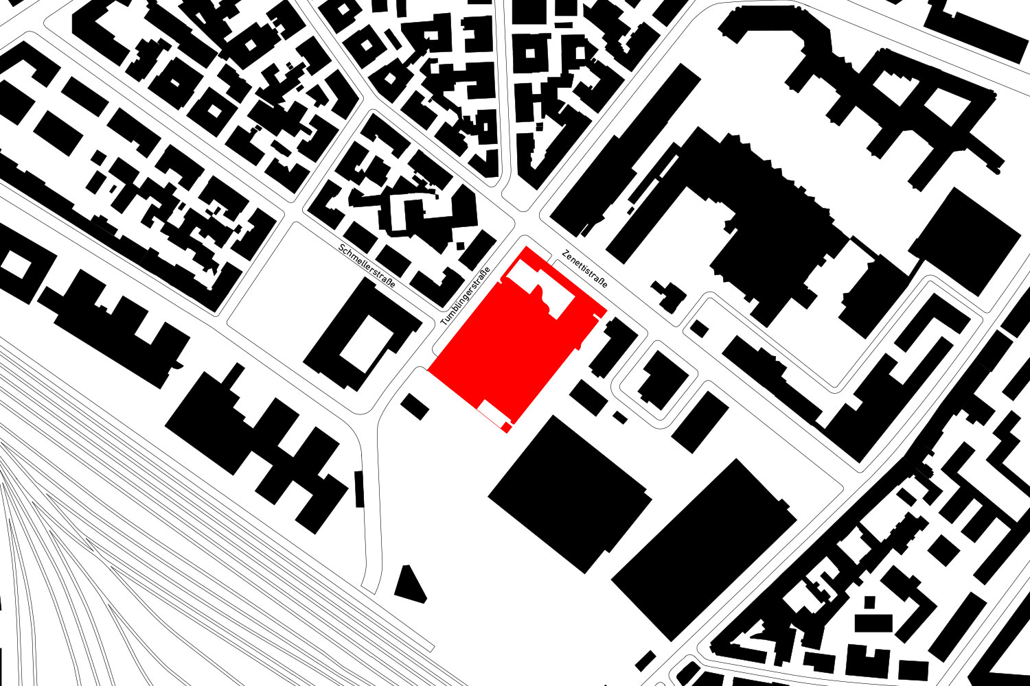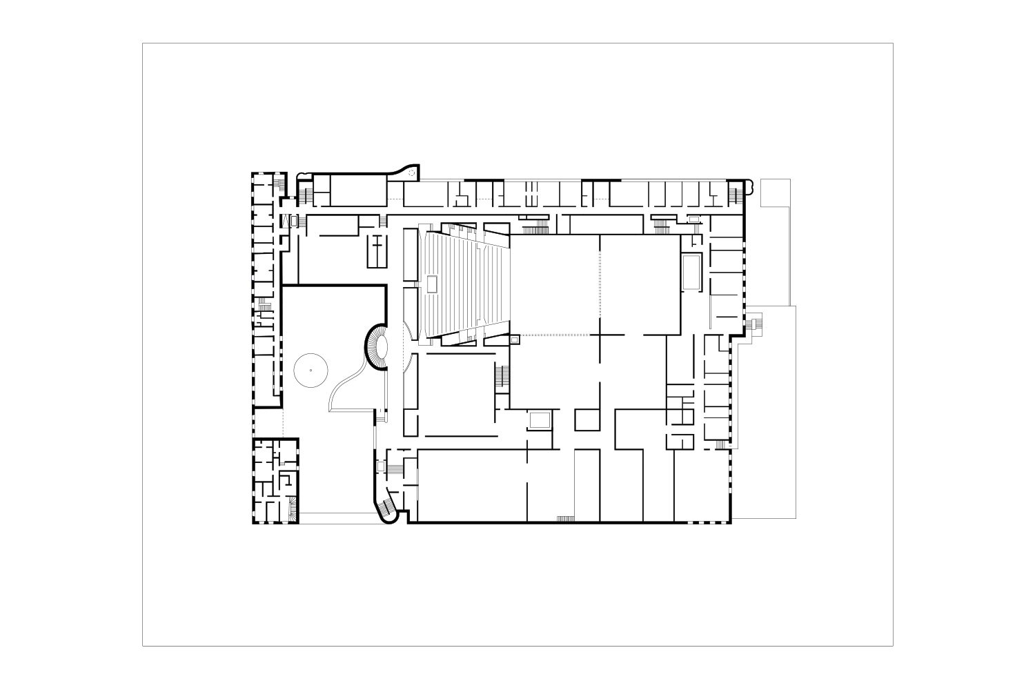 Die großzügigen Glasfassaden von Foyer und Café können im Sommer zum Hof hin geöffnet werden. Aus der Form des Grundstücks ergibt sich der längliche Zuschnitt des Foyers mit seiner markanten Farbgebung. Anlieferung, Werkstätten und Lagerräume sowie die Bühnenbereiche beanspruchen den südlichen Teil des Baufelds, dazwischen liegen der Zuschauerraum für 600 und die zweite Spielstätte für 200 Personen. Die Verwaltungsspange bildet die Ostseite des Gebäudes und ist mit dem Altbau verbunden.