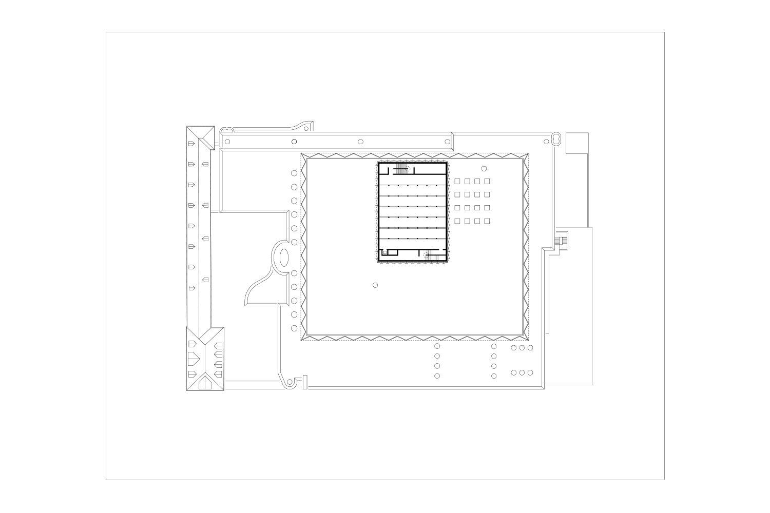 Zwischen dem Altbau, einem schmalen Gebäuderiegel mit Klinkerfassade an der Nordseite des Grundstücks, und dem neuen Foyer ist ein Hof positioniert, der sich mit einem großen, aus roten Ziegeln gemauerten Bogen zur Straße hin öffnet. Der Torbogen verbindet Alt- und Neubau. Gegenüber öffnet sich die Fassade des Neubaus mit seinem Haupteingang. Im hinteren Teil des Hofs befindet sich der Außensitzbereich des angrenzenden Theaterrestaurants.