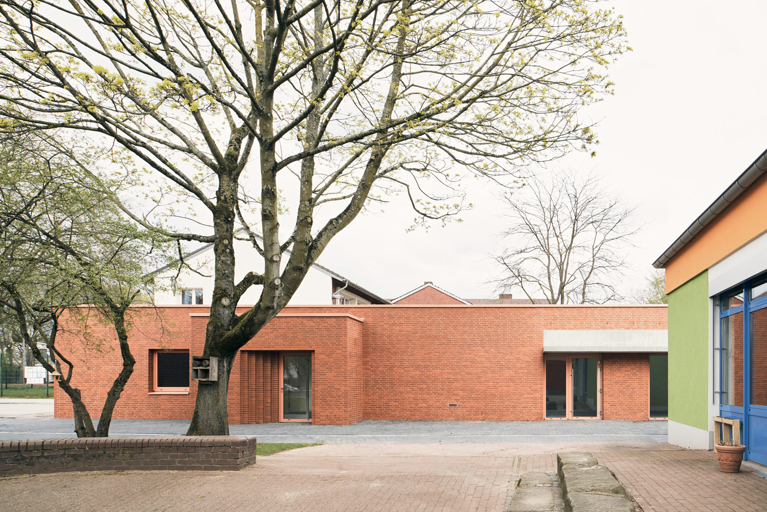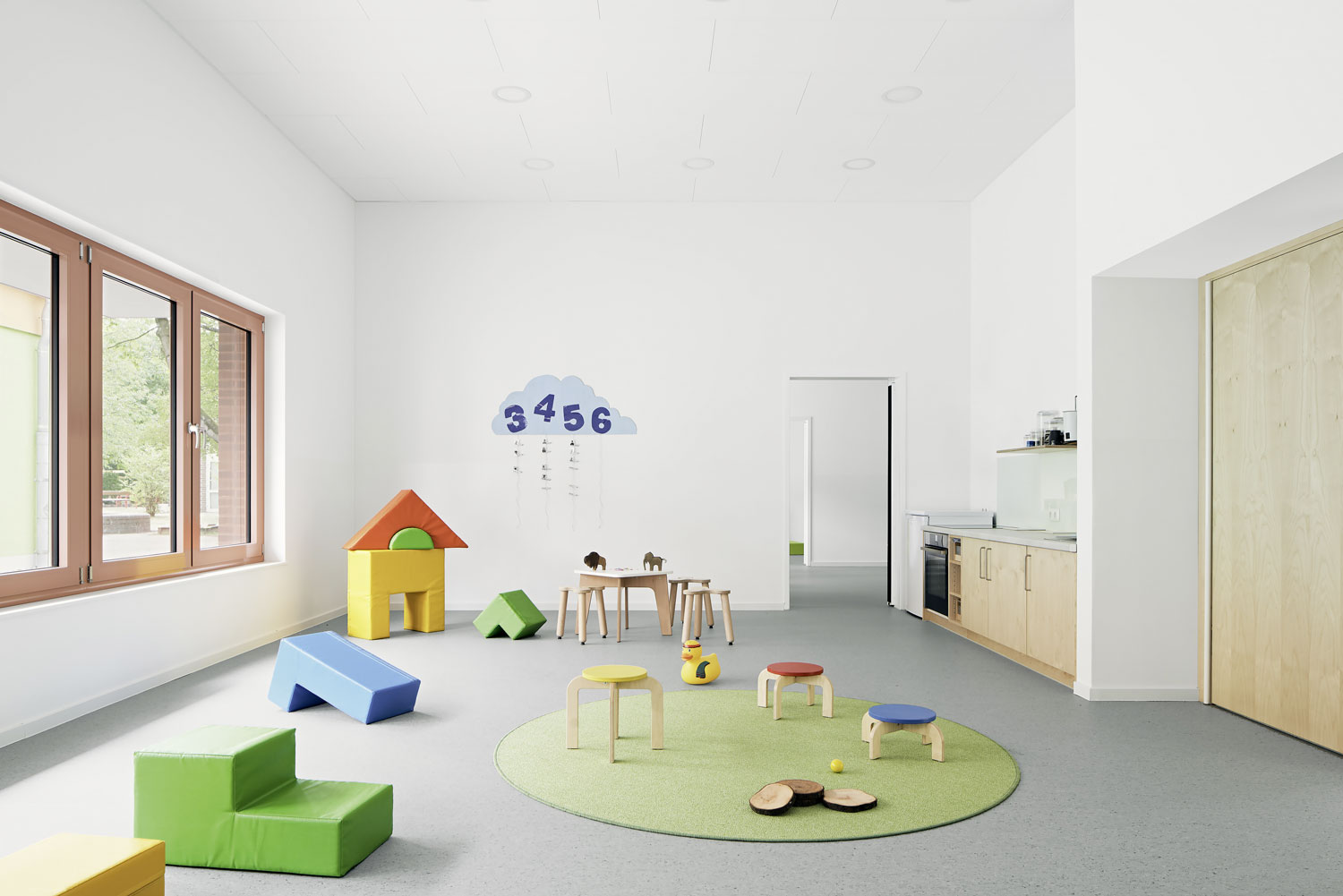 Der Gebäudekörper bildet sich von außen in seiner Materialisierung als rotes Backsteinvolumen ab und bildet so eine Verwandtschaft zu den Bestandsbauten der Landwehrschule aus den 1950er-Jahren. Das Gebäude wird auf der Südseite durch einen leicht expressiv gestalteten nach innen gestaffeltem Eingang erschlossen. Der Grundriss ist einfach gehalten: Über einen Flur, der sich beinahe über die gesamte Gebäudelänge erstreckt, werden die beiden Gruppenräume erschlossen. Die Gruppenräume schieben sich leicht aus der Gesamtvolumetrie heraus. Dabei entstehen Raumnischen, die von den Garderoben in Form eines raumfüllenden Holzmöbels aufgenommen werden und klare Orientierungspunkte für die Kinder im Inneren des Gebäudes schaffen.