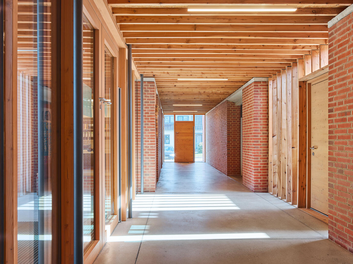 Die Ausstattung des Gebäudes wird durch natürliche Materialien und Farben beherrscht. Die großflächigen Fenster in den Gruppenräumen, Lichthöfen und im Flur schaffen angenehm natürliches Licht. Das Material Holz dominiert in der Ausstattung und kontrastiert mit dem außen präsenten Backstein. Neben den Holzfenstern und Parkettböden sind die Decken der Bereiche, die die einzelnen kleinen Häuser miteinander verbinden, als sichtbare Lärchenholzkonstruktionen ausgeführt. Die Ausstattungselemente des Gebäudekomplexes werden ebenfalls in natürlichen Materialien und Farben passend zum Gesamtkonzept gehalten.