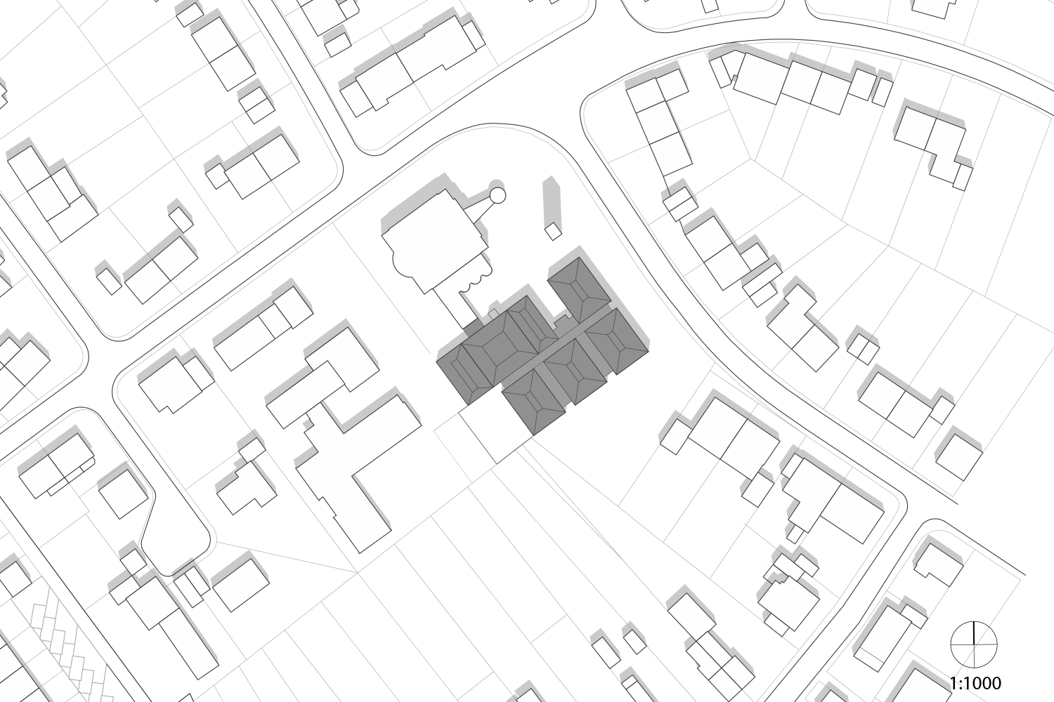 Durch die sichtbare Unterteilung des Gruppenbaus in differenzierte Baukörper wird die Maßstäblichkeit vor allem für Kinder greifbar und die Gebäudeteile in ihren Funktionen unterscheidbar. Der Pfarrsaal, mit eigenem Foyer, sowie der Kindergarten haben jeweils separate Vorhöfe und sind vom Kirchplatz aus zu erschließen. Der eingeschossige Kindergarten wird über einen hellen Gang erreicht, der die Gruppenräume von den Personalräumen und dem Pfarrsaal trennt. Hierdurch wird eine Verbindung zwischen den Baukörpern geschaffen. Gleichzeitig wird eine Fuge ausgebildet, die der klaren Trennung der Funktionen dient und für einfache Orientierung sorgt. Die einzelnen Gruppenräume und ihre Nebenbereiche, die wiederum durch kleine Höfe getrennt sind, öffnen sich zu einem Spielgarten. Die allgemeinen Räume, wie Personalraum und Küche liegen am Kirchplatz und können separat erschlossen werden.