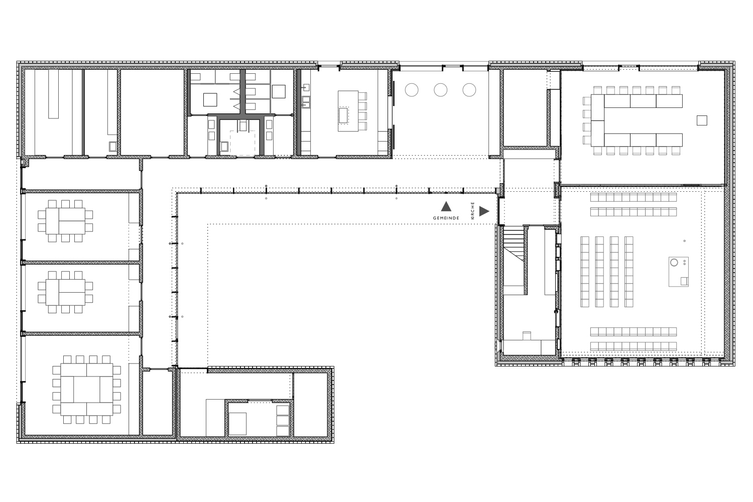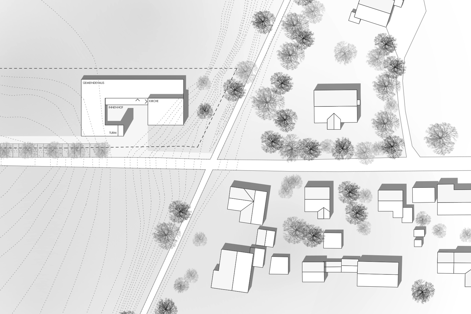 Das Dietrich-Bonhoeffer-Gemeindezentrum definiert mit kompakter, plastisch ausgebildeter Hoftypologie einen neuen signifikanten Ort auf einer kleinen Anhöhe am nordwestlichen Ortsrand von Kösching. Kirche, Gemeindezentrum und Glockenturm gruppieren sich um einen zentralen Innenhof der sich nach Süden öffnet.