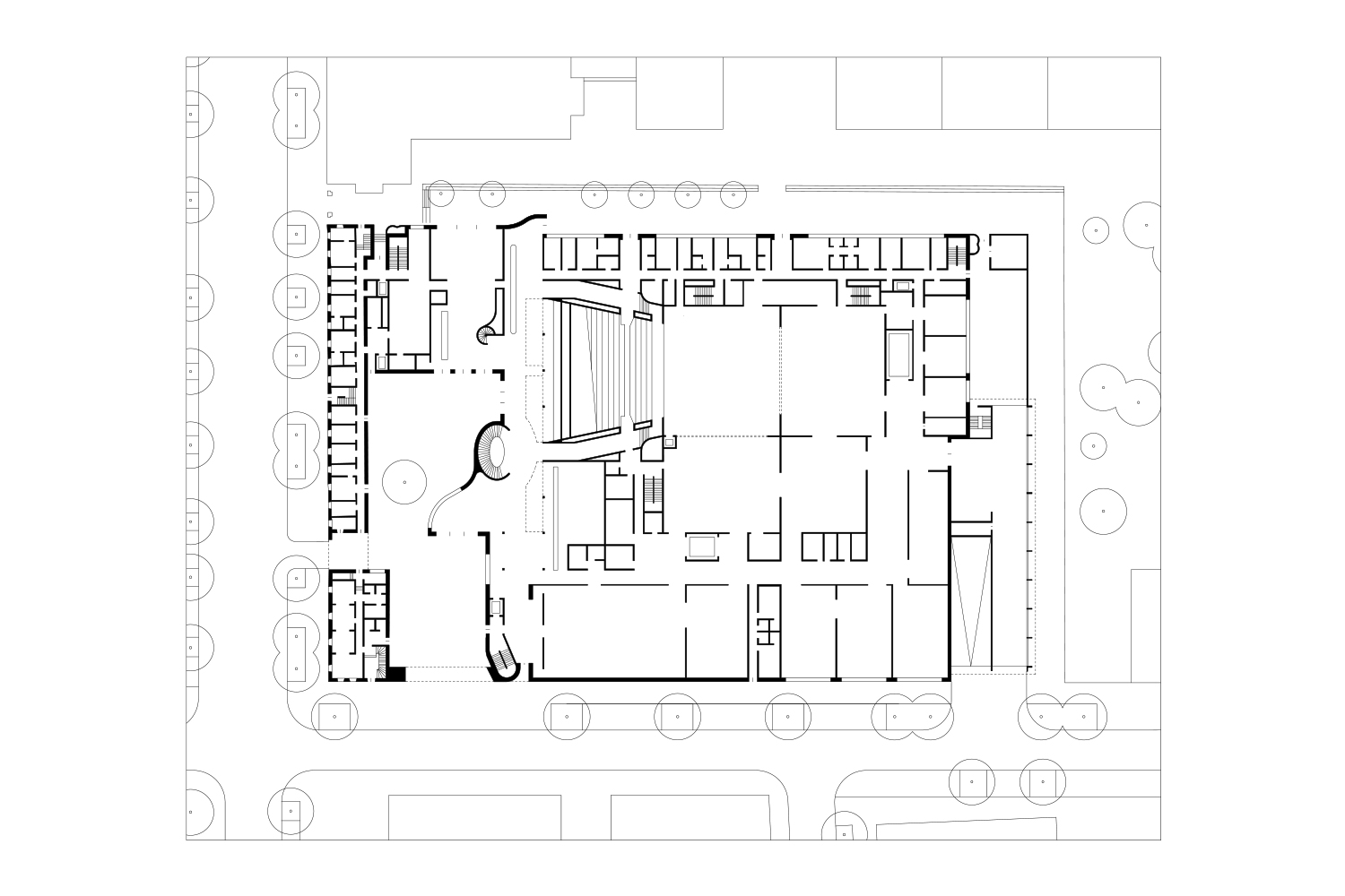 Die großzügigen Glasfassaden von Foyer und Café können im Sommer zum Hof hin geöffnet werden. Aus der Form des Grundstücks ergibt sich der längliche Zuschnitt des Foyers mit seiner markanten Farbgebung. Anlieferung, Werkstätten und Lagerräume sowie die Bühnenbereiche beanspruchen den südlichen Teil des Baufelds, dazwischen liegen der Zuschauerraum für 600 und die zweite Spielstätte für 200 Personen. Die Verwaltungsspange bildet die Ostseite des Gebäudes und ist mit dem Altbau verbunden.