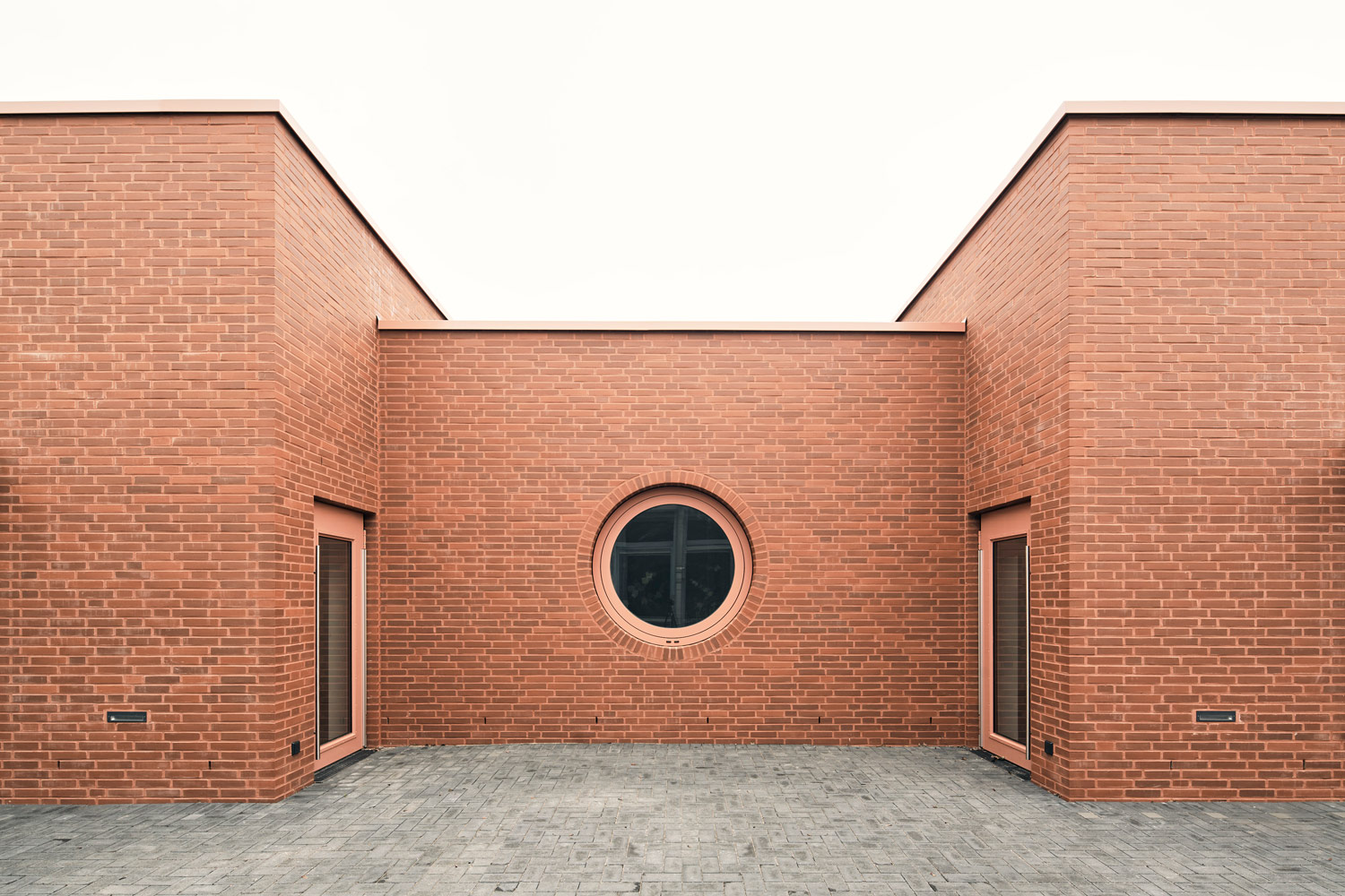 Der Gebäudekörper bildet sich von außen in seiner Materialisierung als rotes Backsteinvolumen ab und bildet so eine Verwandtschaft zu den Bestandsbauten der Landwehrschule aus den 1950er-Jahren. Das Gebäude wird auf der Südseite durch einen leicht expressiv gestalteten nach innen gestaffeltem Eingang erschlossen. Der Grundriss ist einfach gehalten: Über einen Flur, der sich beinahe über die gesamte Gebäudelänge erstreckt, werden die beiden Gruppenräume erschlossen. Die Gruppenräume schieben sich leicht aus der Gesamtvolumetrie heraus. Dabei entstehen Raumnischen, die von den Garderoben in Form eines raumfüllenden Holzmöbels aufgenommen werden und klare Orientierungspunkte für die Kinder im Inneren des Gebäudes schaffen.