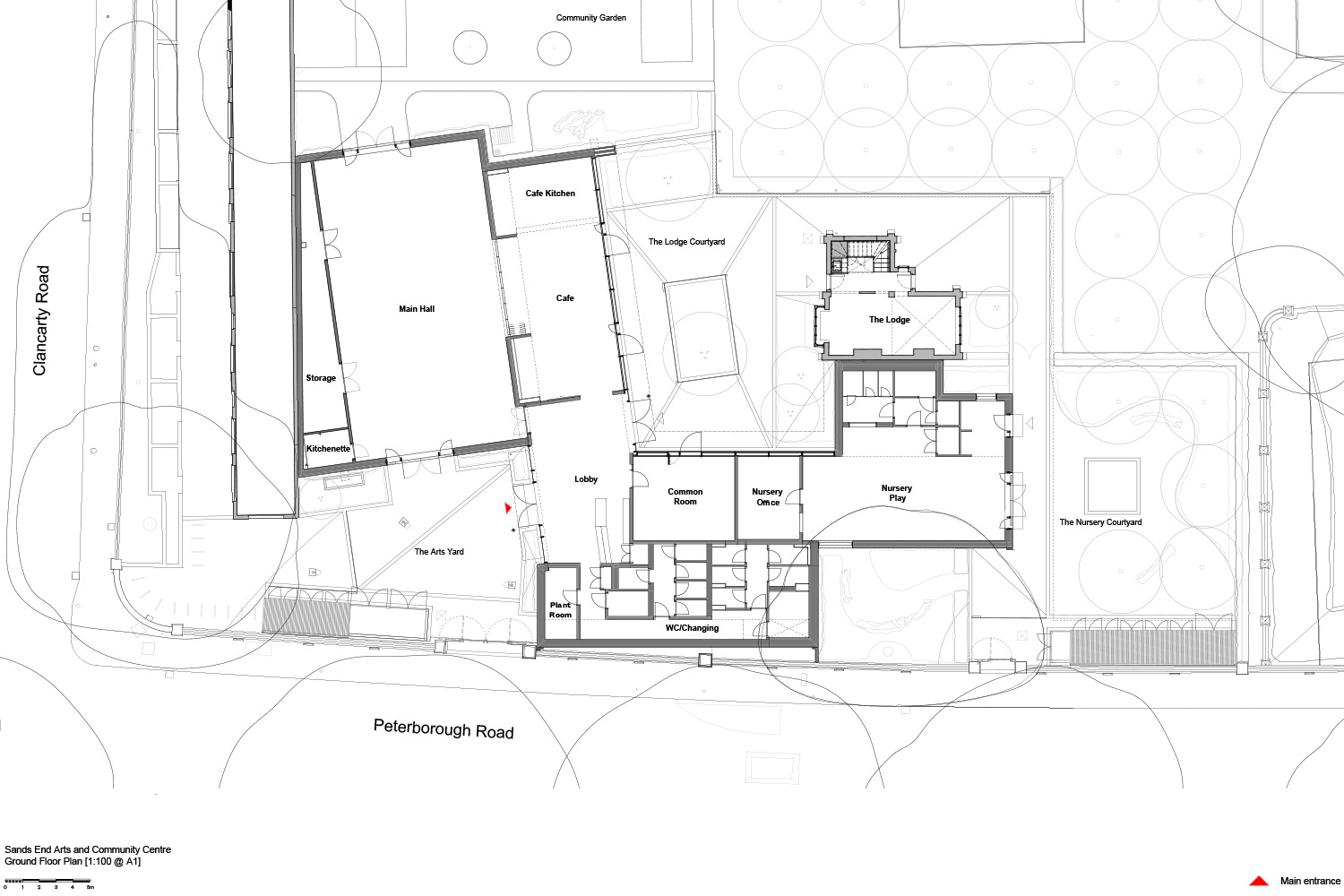 Die Clancarty Lodge markiert den Eingang zum Park und zeichnet sich durch außenliegende Details aus Holz-Faïence sowie ein Dach aus, das typisch für Londoner Parkbauten dieser Zeit ist. Mit Blick auf den Denkmal- und Bestandsschutz behielt Mæ das Gebäude, renovierte und reparierte es und schuf darin neue Kunsträume. Community-basiertes Feedback prägte die Ausrichtung des Projekts maßgeblich und führte zur Ergänzung einer hölzernen Mezzanine-Ebene in der Lodge, die zusätzlichen Arbeitsraum und einen doppelgeschossigen Ausstellungsbereich schafft. Um die Zugänglichkeit für unterschiedliche Mobilitätsbedürfnisse zu verbessern, führte Mæ zudem einen stufenlosen Zugang in das Bestandsgebäude ein – zuvor war der Eintritt nur über Treppen möglich.