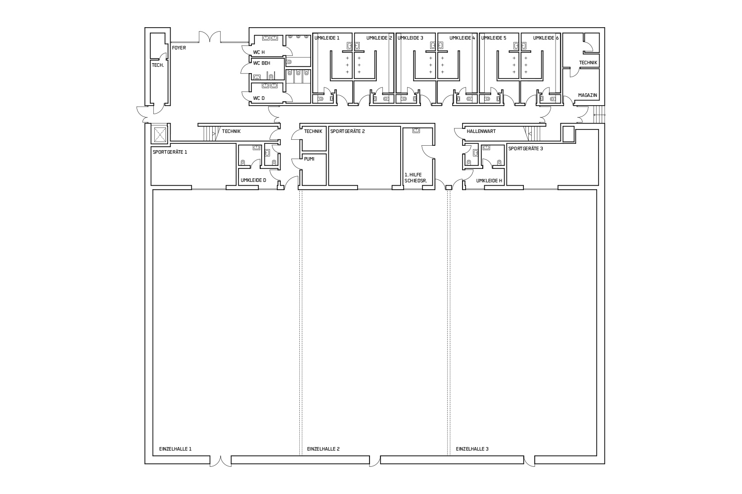 Die Sporthalle stellt sich als kompaktes, gut strukturiertes und damit wirtschaftliches Gebäude mit kurzen, übersichtlichen Wegen dar. Der gesamte Sporthallenbereich ist barrierefrei konzipiert und über das zentrale Foyer übersichtlich erschlossen. Um dem Hochleistungssport optimale Bedingungen ohne Blendungen zu ermöglichen, wurde eine natürliche Belichtung der Halle ausgeschlossen. Die Zuschauertribüne mit ihren 199 Sitzplätzen wird hingegen über ein durchgehendes Oberlicht belichtet.
