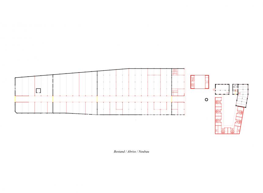 Um ein „Auseinanderfallen“ der beiden entstandenen Teile der Sheddachhalle zu unterbinden, wurden beide Seiten des Hallenendes überdacht gelassen und geben den Eingängen in die Halle einen würdigen Rahmen. Der Solitär versteht sich als Bindeglied und Gelenk zwischen den bisher bestehenden Baukörpern. In seiner Archaik markiert der Solitär schon von weitem diesen Ort und ist das Prägnanteste und zugleich öffentlichste Gebäude. In ihm finden sich ein Café, ein Veranstaltungsraum, ein Seminarraumgeschoss, sowie die Herberge wieder. In seiner Grundrisskonfiguration ist der Solitär pragmatisch, wie effizient gedacht; zwei dienende Funktionsspangen umklammern einen großen auf die Nutzung hinausgerichteten Raumkörper. Das Verwaltungsgebäudes bietet in seinem guten rohbauähnlichen Zustand die perfekte Grundlage für behutsame kleinere Eingriffe. So wird im Inneren der Bau durch eine neue zweite Haut ergänzt, um auch thermischen Anforderung gerecht zu werden.
