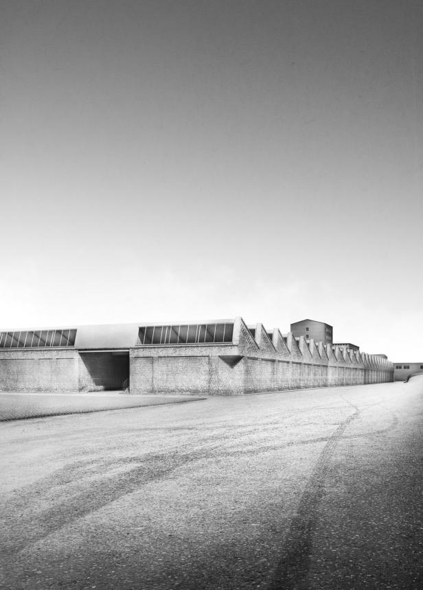 Allerdings besteht die Notwendigkeit die vorhandenen Fragmente mit stadttypischen Typologien zu vervollständigen. Das Projekt versucht hierbei städtebauliche Fragestellungen zu beantworten, in dem die Eingriffe auf den Kontext bezogen formatiert und in ihrem Proportionen und Ausdruck auf die jeweilige Umgebung und Situation hin arrangiert. Klassische Stadtbausteine - Platz, Straße, Innenhof, Fassade - waren hierfür ausschlaggebende Betrachtungsebenen. Dabei war es ein zentrales Anliegen Sehnsuchtsorte zu schaffen, von dem eine suggestive Kraft ausgeht. Die hinzugefügten Baukörper besitzen allesamt einen prägnanten, räumlich-plastischen Charakter und sollen sich unwiderruflich ins Gedächtnis schreiben und in Einklang auf die vorhandene Bebauung, Landschaft der Umgebung, sowie Topographie treten. Die vorhandene Baustruktur der Sheddachhalle bekommt durch den Schnitt über die gesamte Hallenlänge hinweg eine innere Straße, durch die eine neue räumliche Organisation und Parzellierung zu Stande kommt und neue Nutzungspotentiale entstehen. Ein nebeneinander von verschiedensten Nutzungen - Werkstätten, Parkplätze, Läden, Gärtnerei u.ä. - können flexibel ihren Platz finden. Die neu entstandene Fassade ist in ihrer repetitiven Gestalt und den Ziamonikaöffnungsflügeln äußerst flexibel, quasi industriell gedacht, so dass jegliche Halleneinteilung denkbar ist.