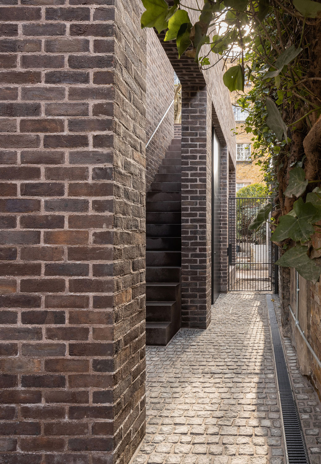 A new precast concrete staircase along the side passageway provides a sense of welcome and identity for the second floor residents. The space is enlivened by ivy growing along the boundary wall, which was preserved and protected during construction. A small concrete bench embedded in the masonry provides a quiet moment to rest.