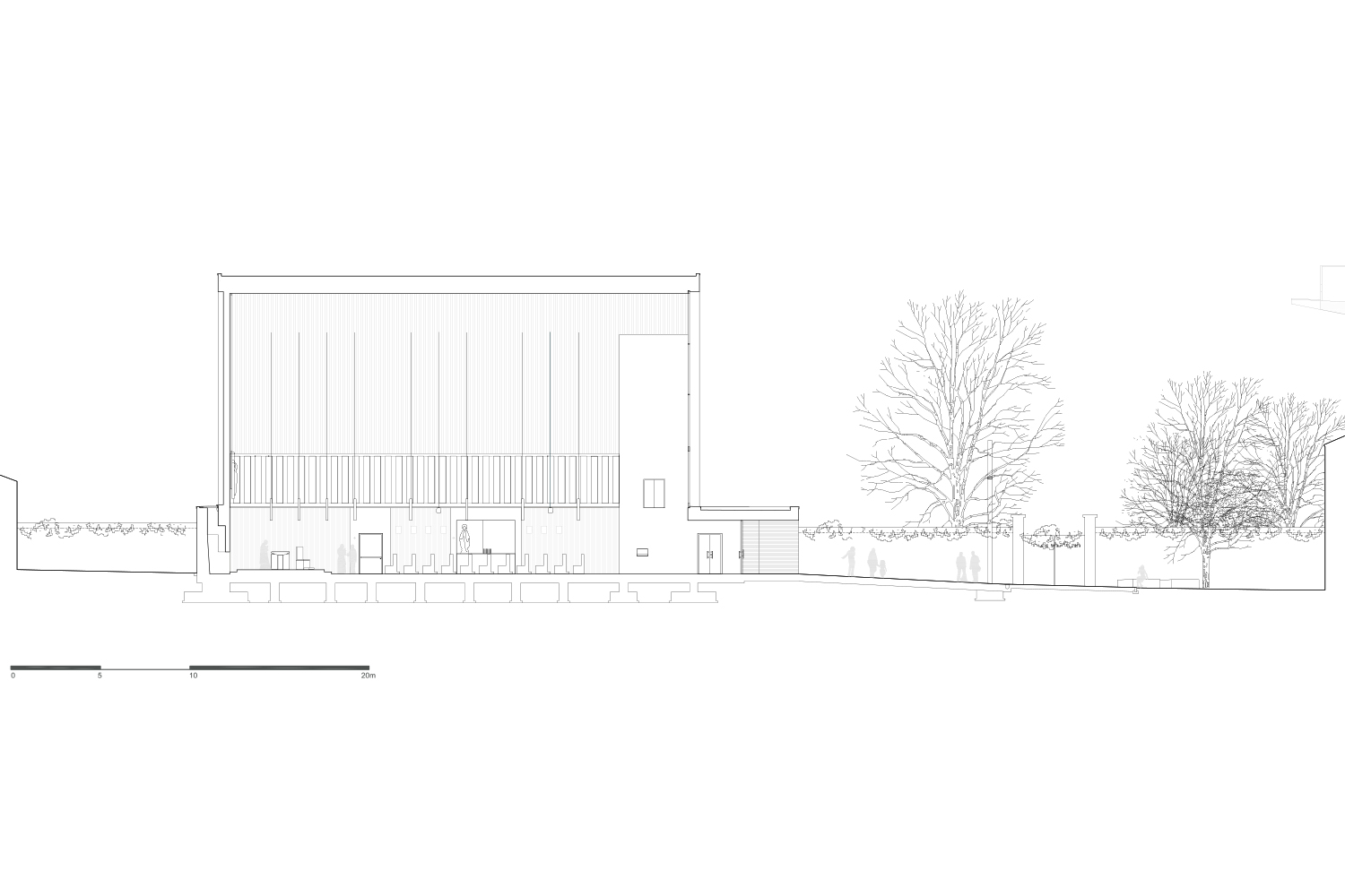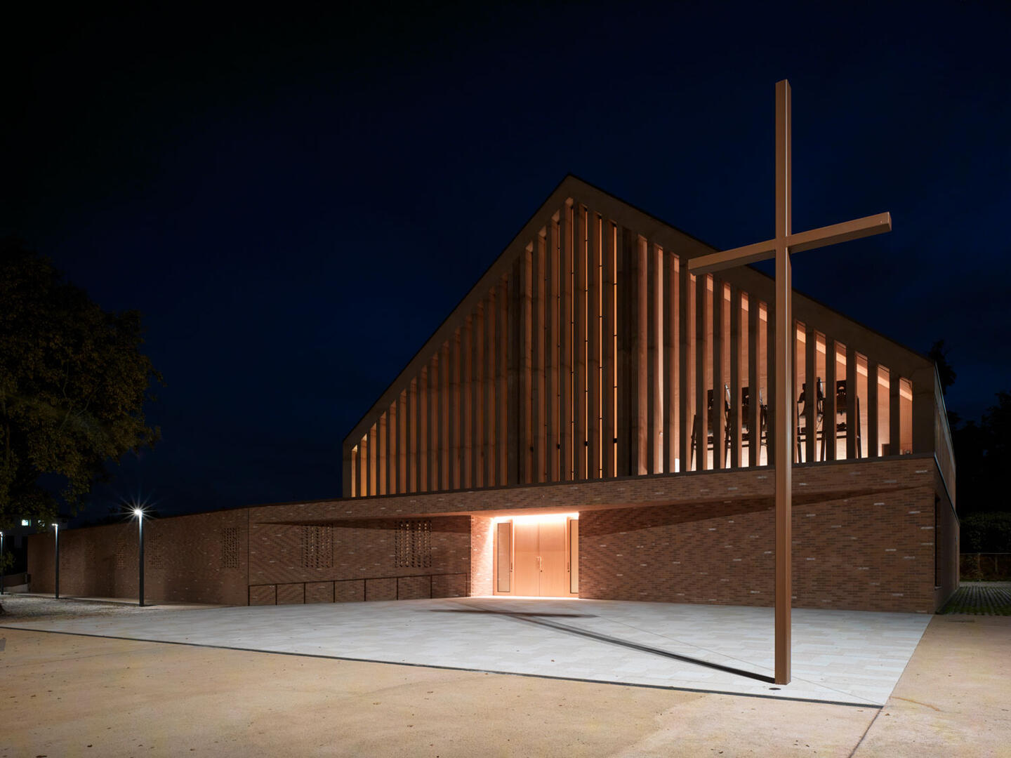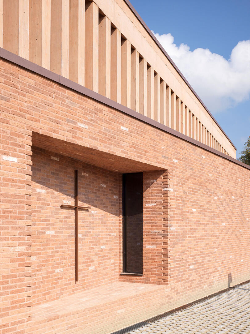 Die Hauptfassade geht auf einer Seite in einen niedrigen Baukörper mit Flachdach über. Dieser Sockelbereich umschließt den Hauptsaal sowie weitere Räume für Gemeindetätigkeiten. Er ist mit einer Mischung aus alten und neuen Ziegeln in unterschiedlichen Farbtönen von Terrakotta bis Dunkelrot verkleidet. Das Mauerwerk erinnert an die Außenwand einer benachbarten Villa aus dem 17. Jahrhundert. Die Fassade knickt zum Hauptportal hin in einen abgesenkten Raum ab. Dieser bietet Schutz und markiert das westliche Ende des zentralen Stadtplatzes. Traditionelle Ziegellattungen verbergen die wenigen Öffnungen zur Straße. Eine Nische in der Wand versteckt das Fenster der eucharistischen Kapelle und bildet zugleich eine Sitzbank für den hinteren Gartenhof.