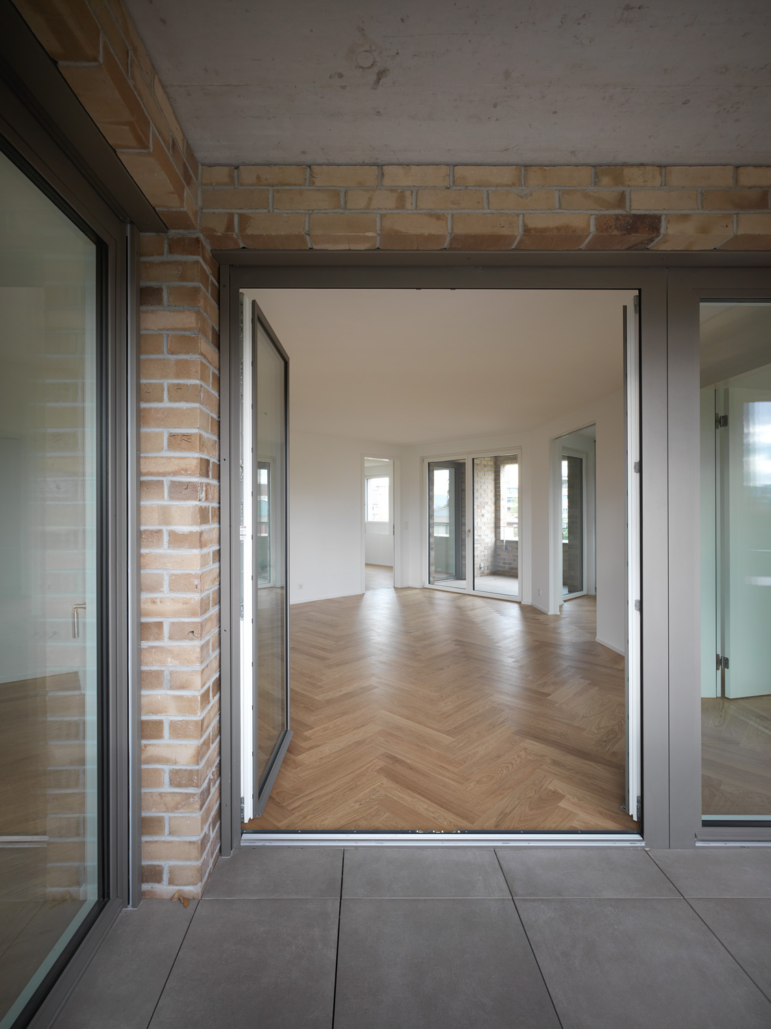 Die Verwendung von wassergezogenen Ringofenziegeln war eine wichtige und frühe Entscheidung für das zeitlose Image des Gebäudes. Die Einzigartigkeit jedes Backsteins und die strukturierte Patina, die sich auf der gesamten Fassade bildet, verleihen dem Gebäude vom ersten Tag an einen starken mineralischen Charakter, während die Metallfenster einen scharfen Akzent setzen. Die Farbe naturalisiert den Backstein, als ob das Gebäude ein Felsen wäre, der aus dem Gelände gewachsen ist. Konstruktiv ist die Fassade eine hinterlüftete Backsteinfassade mit Strukturbetonwänden. An den Loggien säumen Klinkerviertelbacksteine die Betonbrüstungen. Die geometrische Komplexität der Form erforderte ein hohes Maß an Präzision bei der Planung und Ausführung der Backsteinfassade, um die notwendigen Dehnungsfugen zu ermöglichen und gleichzeitig das Bild der Kontinuität zu wahren. Die Komplexität der Form und die Materialität des Backsteins ergeben zusammen das zeitlose Bild des Monolithen.