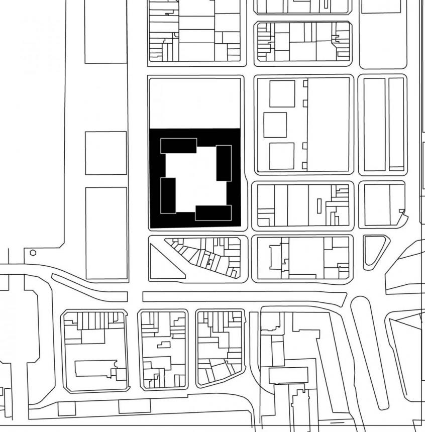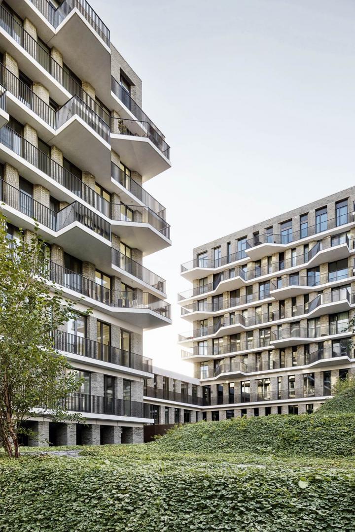 Von der Straße oder dem davorliegenden Platz aus werden die Türme von dem sie umlaufenden Komplex abgeschirmt. Der starke Kontrast des dunklen Sockels der Erdgeschossfassade zu den ausladend gestalteten, weißen Fassadenelementen aus Beton des ersten und zweiten Stockwerks fängt den Blick des Betrachters ein und verbindet die Türme zu einem einheitlichen Gesamtkomplex. Der gemeinschaftlich genutzte Garten im Inneren ist mit Birken und Waldbewuchs gestaltet und bietet Zugang zu den Wohntürmen. Alle Wohneinheiten verfügen über eine Terrasse oder eine Dachterrasse. Die Balkone der Wohnungen in den Türmen befinden sich an allen vier Seiten und sind versetzt angeordnet, sodass sie die optimale Menge an Sonneneinstrahlung bekommen. Gemeinsam mit den Gewerbeflächen des umlaufenden Gebäudeteils bildet das Zusammenspiel von Wohnungen mit anderen Funktionen des städtischen Lebens innerhalb eines Komplexes eine kleine Stadt innerhalb von Antwerpen.