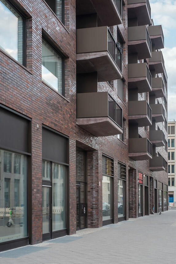 The metropolitan quality of the building is formulated by the dark brick, the abstract window types, the monochrome sunshade and the sculptural detailing.