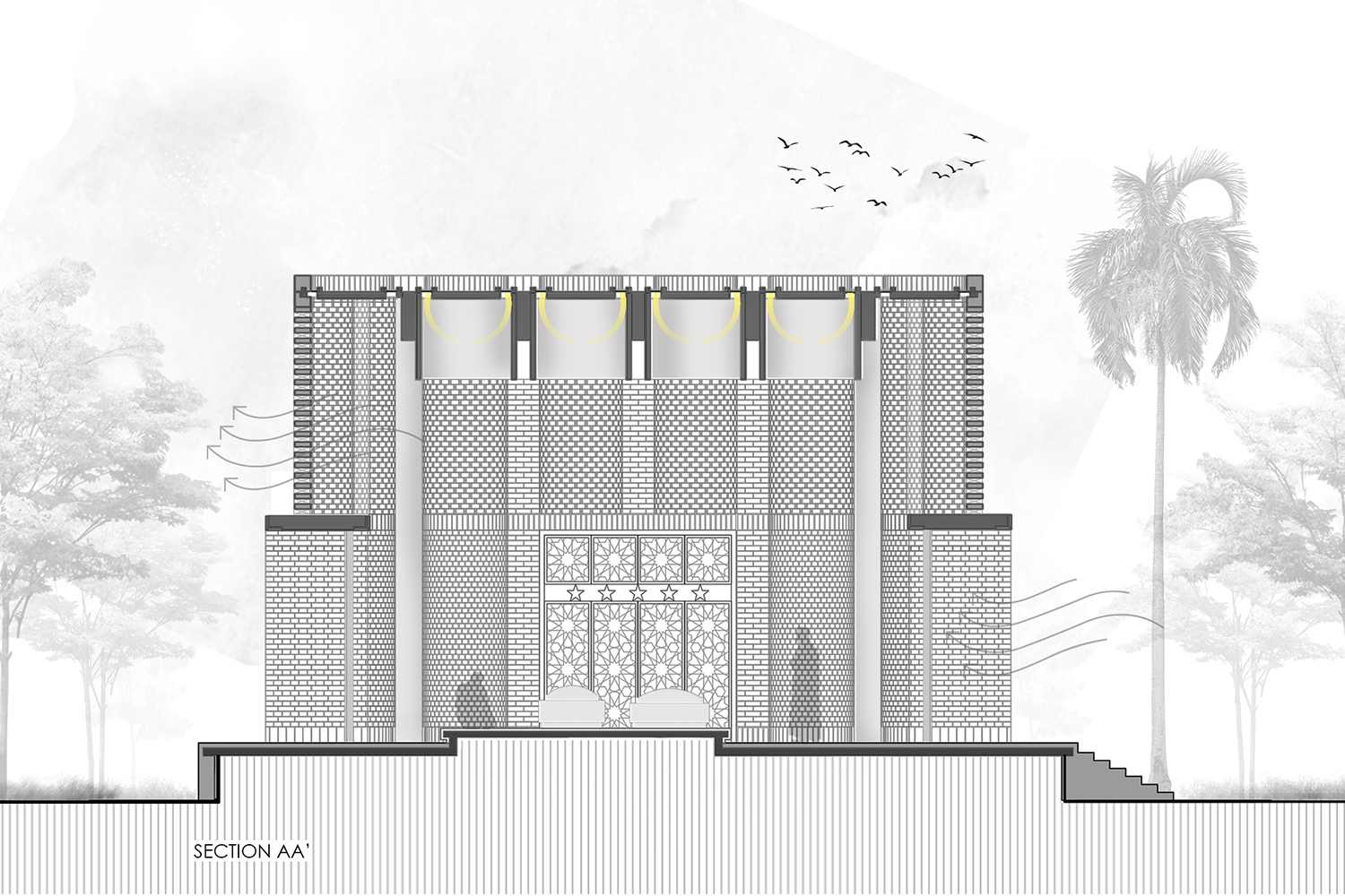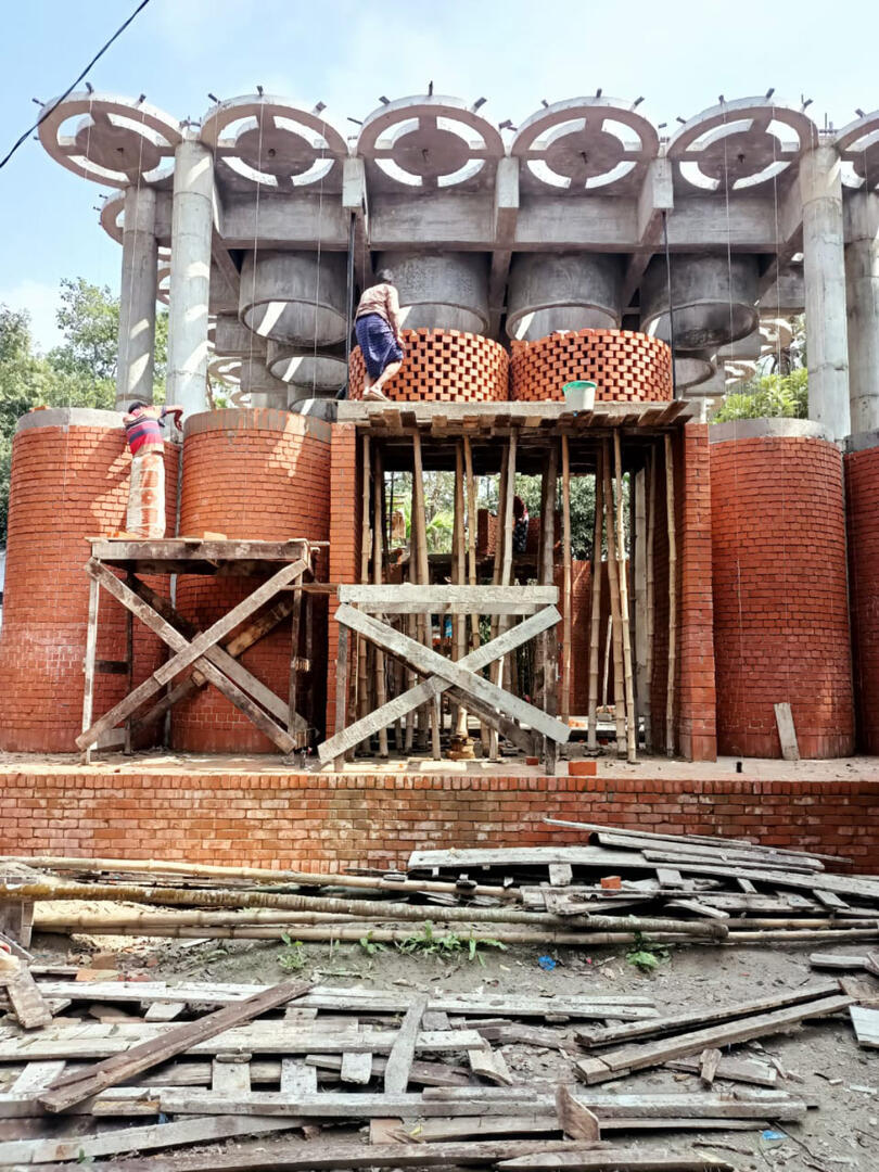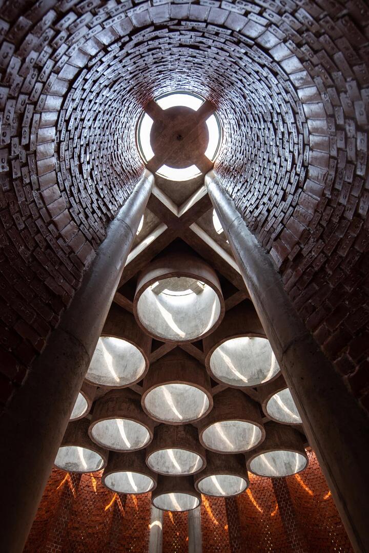 Das Dach, der „Kronleuchter des Paradieses“, lässt das Licht sanft in den Raum fallen, während die 36 kreisförmigen Deckenöffnungen an die Mehrkuppel-Moscheen der Sultani-Periode erinnern und den Blick, wie die Seele, die sich zum Himmel erhebt, nach oben lenken. Auch der rote Backstein, der die Dargah umhüllt, erinnert an die jahrhundertealte Bautradition der Sultani-Zeit. Er wurde von Hand im nahegelegenen Ziegelwerk gebrannt. Die Wände werden aus sich wiederholenden kleinen Türmen gebildet, die eine vertraute, aber zugleich ikonische Komposition schaffen. Während die untere Hälfte der halbkreisförmigen Türmchen eine schützende Mauer bilden, ist die obere Hälfte von einem Jali- Gitter perforiert, das für natürliches Licht und Belüftung sorgt.