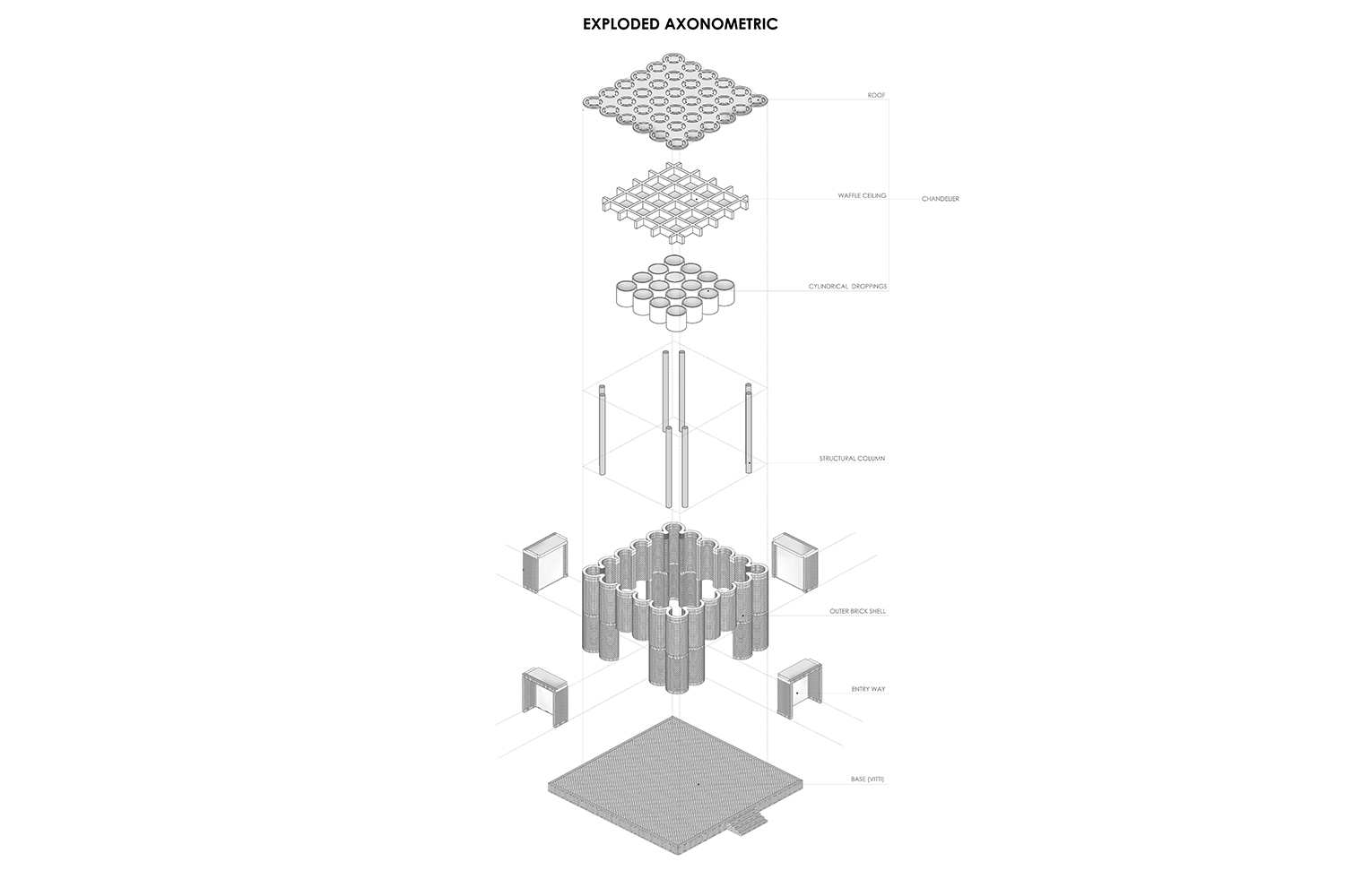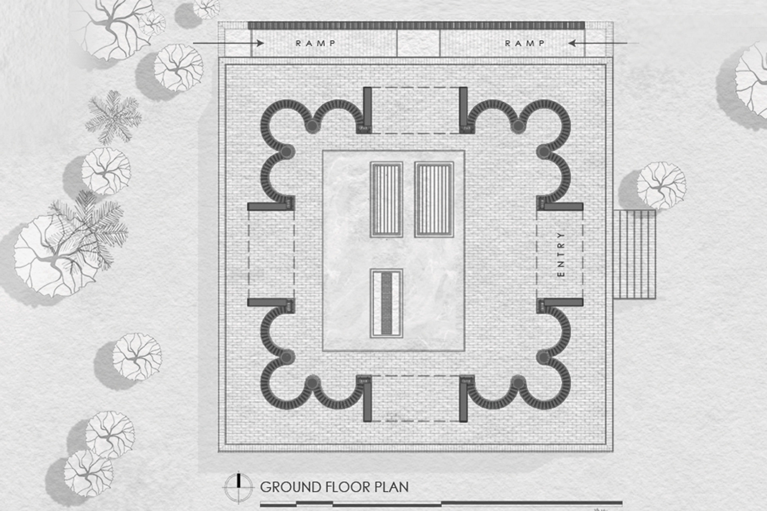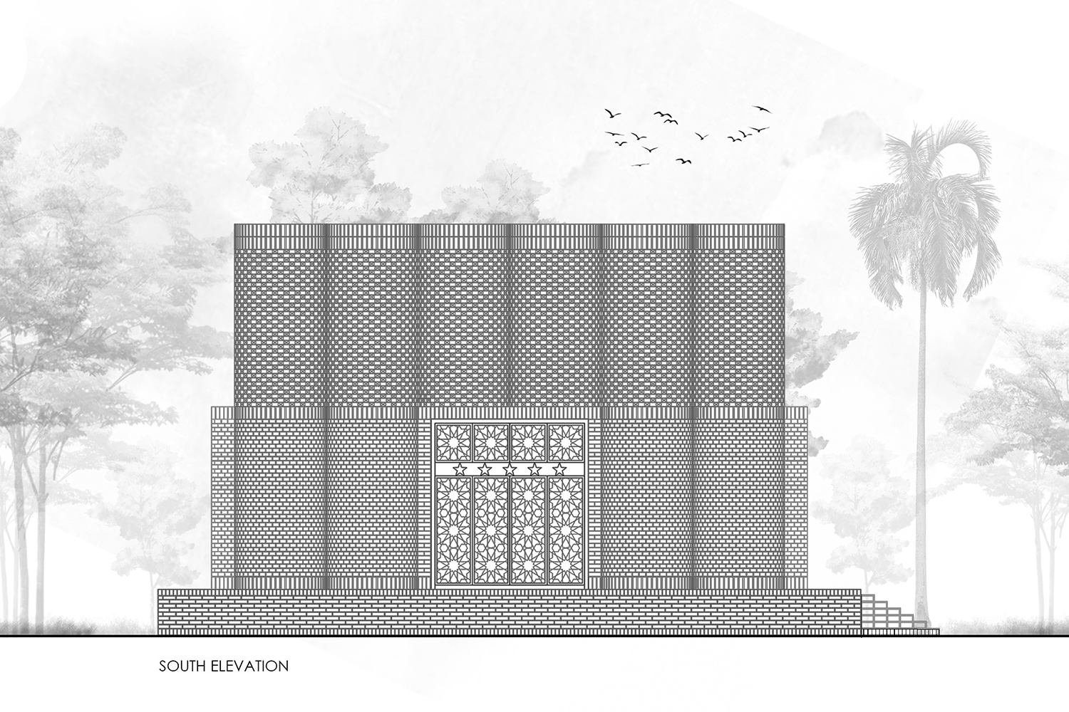 Das Dach, der „Kronleuchter des Paradieses“, lässt das Licht sanft in den Raum fallen, während die 36 kreisförmigen Deckenöffnungen an die Mehrkuppel-Moscheen der Sultani-Periode erinnern und den Blick, wie die Seele, die sich zum Himmel erhebt, nach oben lenken. Auch der rote Backstein, der die Dargah umhüllt, erinnert an die jahrhundertealte Bautradition der Sultani-Zeit. Er wurde von Hand im nahegelegenen Ziegelwerk gebrannt. Die Wände werden aus sich wiederholenden kleinen Türmen gebildet, die eine vertraute, aber zugleich ikonische Komposition schaffen. Während die untere Hälfte der halbkreisförmigen Türmchen eine schützende Mauer bilden, ist die obere Hälfte von einem Jali- Gitter perforiert, das für natürliches Licht und Belüftung sorgt.